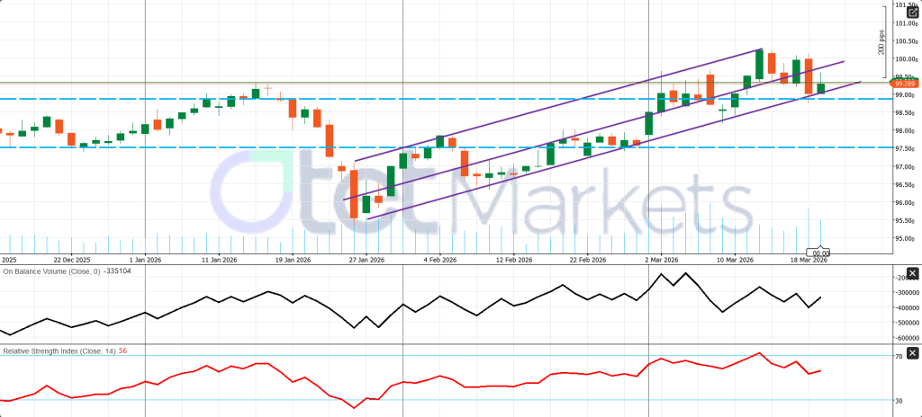 The daily structure remains mildly bullish, with price still moving inside a rising channel, though momentum has cooled after the recent push toward the upper boundary. As long as DXY holds above 99.00, the short-term uptrend remains intact and another move toward 100.00–100.30 stays possible. A break below 99.00 would weaken the setup and expose 98.50, then possibly 97.50. RSI remains positive but no longer overbought, while OBV suggests the rebound has lost some conviction.