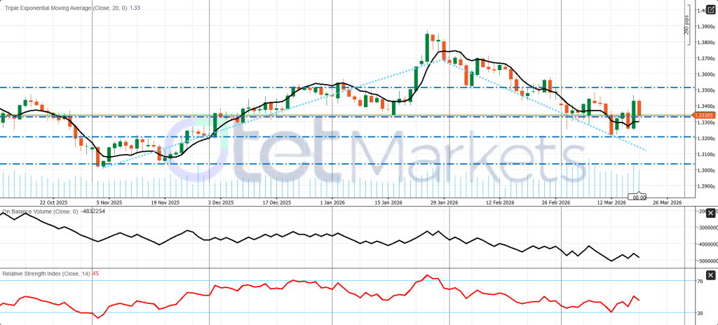 The daily bias is neutral to slightly bearish. Price is near 1.3340, close to an important pivot zone, but the rebound still looks corrective rather than a clear bullish reversal. TEMA suggests limited trend conviction, RSI near 45 shows soft momentum, and OBV remains weak.