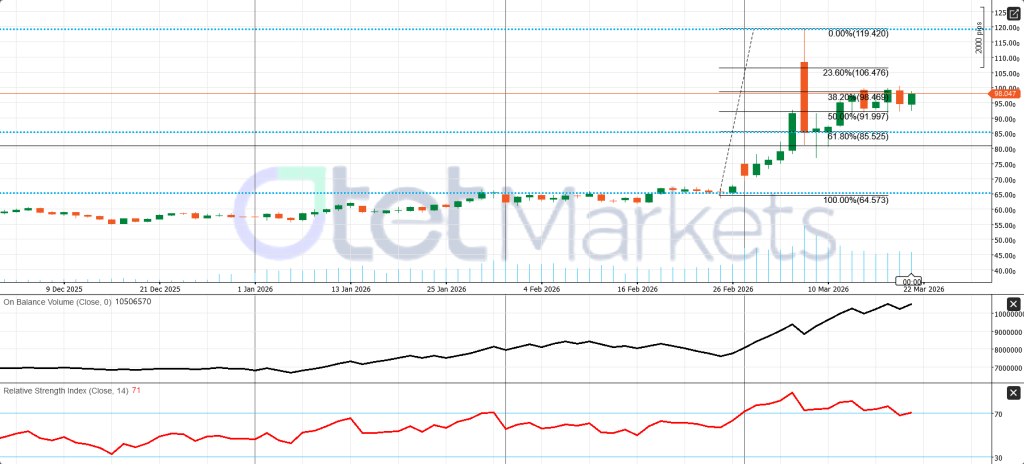 WTI still looks like a bullish market in consolidation, not a confirmed reversal. Price is near 98.0, just below an important pivot around 98.5. RSI remains strong but near overbought, while OBV still supports the broader uptrend. Immediate resistance stands at 98.5 and 106.5. Support is at 92.0, then 85.5. As long as WTI holds above 92.0, the broader bullish structure remains intact.