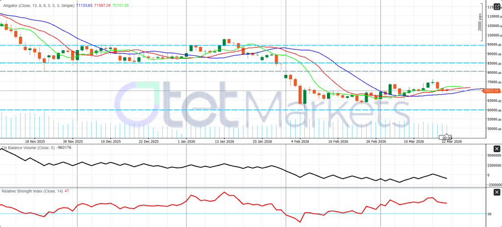 The base case remains choppy, two-way trading with only a slight recovery bias if macro conditions calm. The bullish scenario would require softer U.S. data, lower yields, calmer oil, and a steadier dollar. The bearish case would come from stronger inflation signals, firmer yields, another rise in oil, or broader risk-off pressure. In that environment, the $70,000 area remains the key anchor for the market.